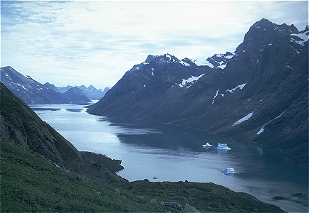Lunch would be followed by a walk on the hills behind Bodowen, with black labrador Bella and Toff the terrier as company. The picture here shows Tilman with one of the sheepdogs at Egon Jensen’s farm near Nanortalik in 1970. We spent a few days anchored in a delightful inland fjord here, working on the boat and exploring the local scenery. The Jensen’s were running an experimental sheep farm in the south west of Greenland, an exercise which benefited from state funding from the Danish government.